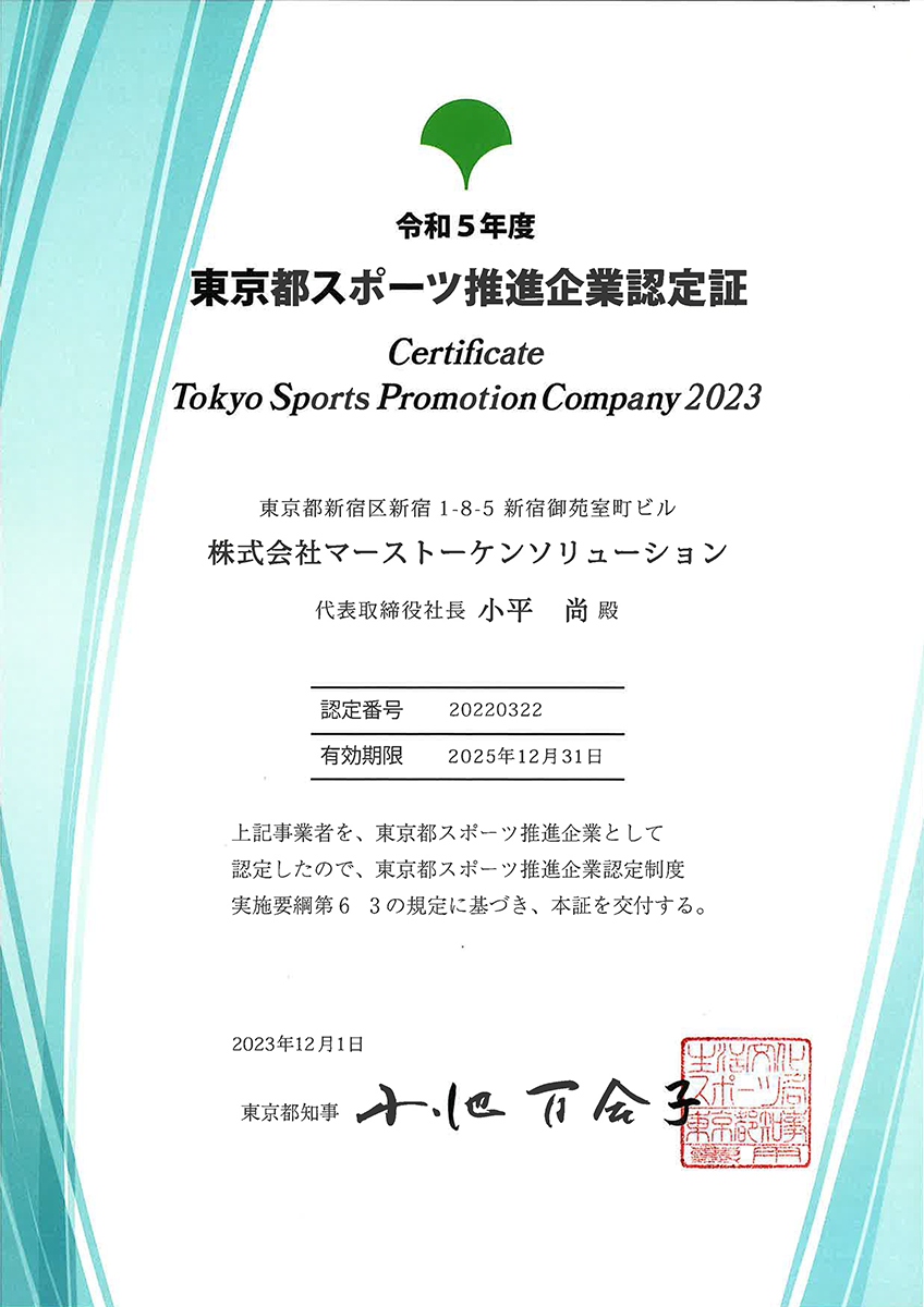 東京都が2015年度から従業員のスポーツ活動の促進に向けて、優れた取り組みやスポーツ分野における支援を実施している 企業等を認定する制度です。2023年12月、当社は令和5年度「東京都スポーツ推進企業」に認定されました。2021年から4年連続の認定となります。